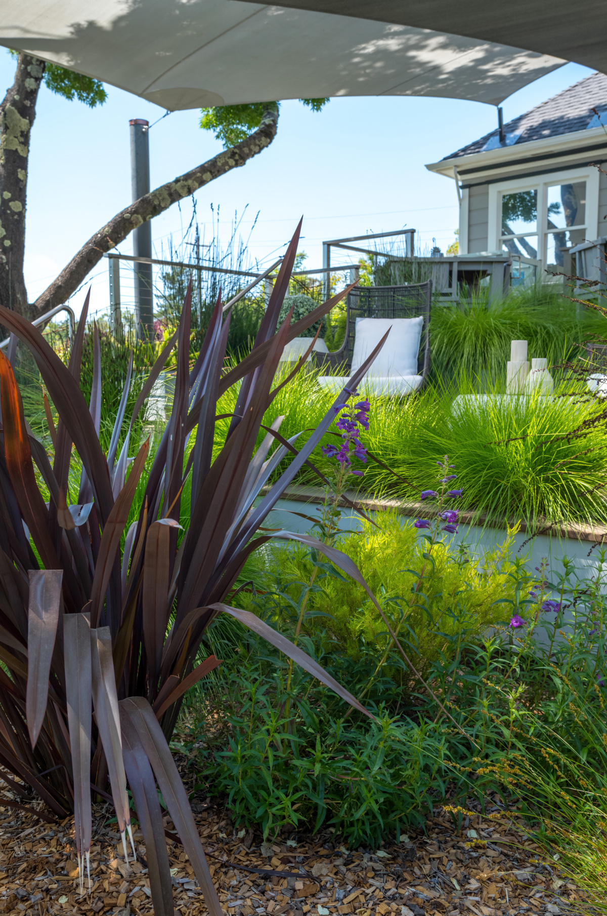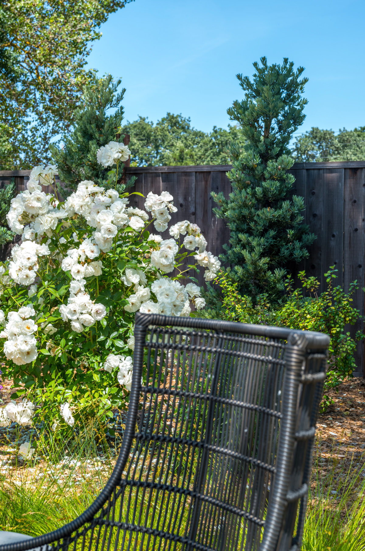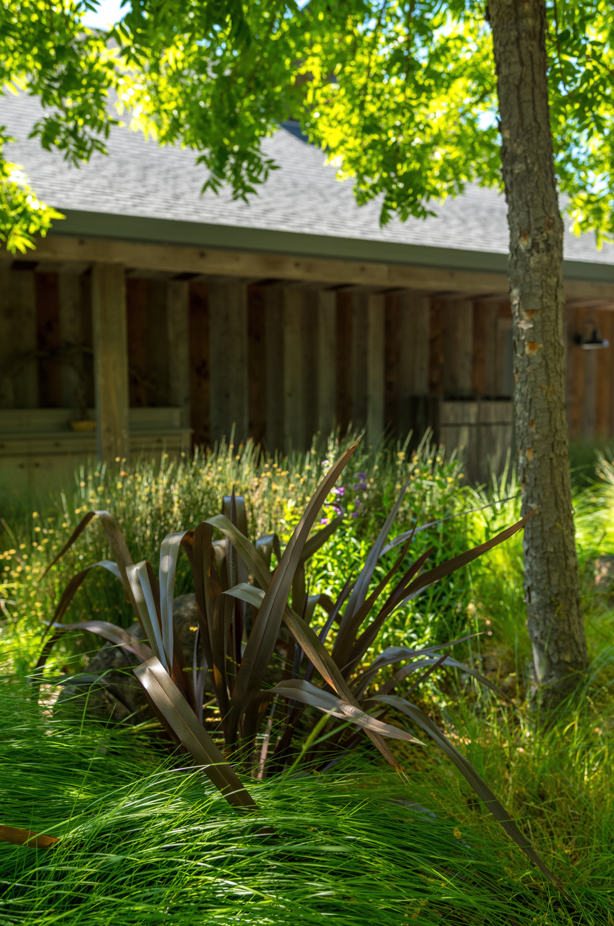 Our completed redesign of this space incorporated all existing trees and we added to these mature trees a large variety of new plants, including Sprenger’s Asparagus, Berkeley Sedges, Cape Rushes, Golden Eleagnus, Blue Rushes, Pacific Coast Myrtles, Midnight Beard Tongues, Slender Veldt Grasses, Chinese Pistaches, King Edward’s Winter Currant, and gorgeous Catalina Perfumes.